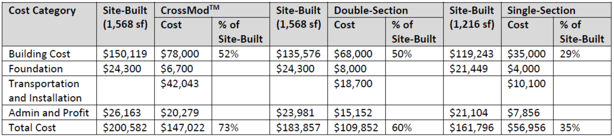 A 2023 study by the Joint Center for Housing Studies at Harvard University compares the costs of manufactured homes with those of a similar-sized site-built home. Single-section and double-section manufactured homes were 35% and 60%, respectively, of the cost to build the same size site-built home. The table below summarizes the analysis from the study. It’s important to note that this analysis does not include the cost of land.